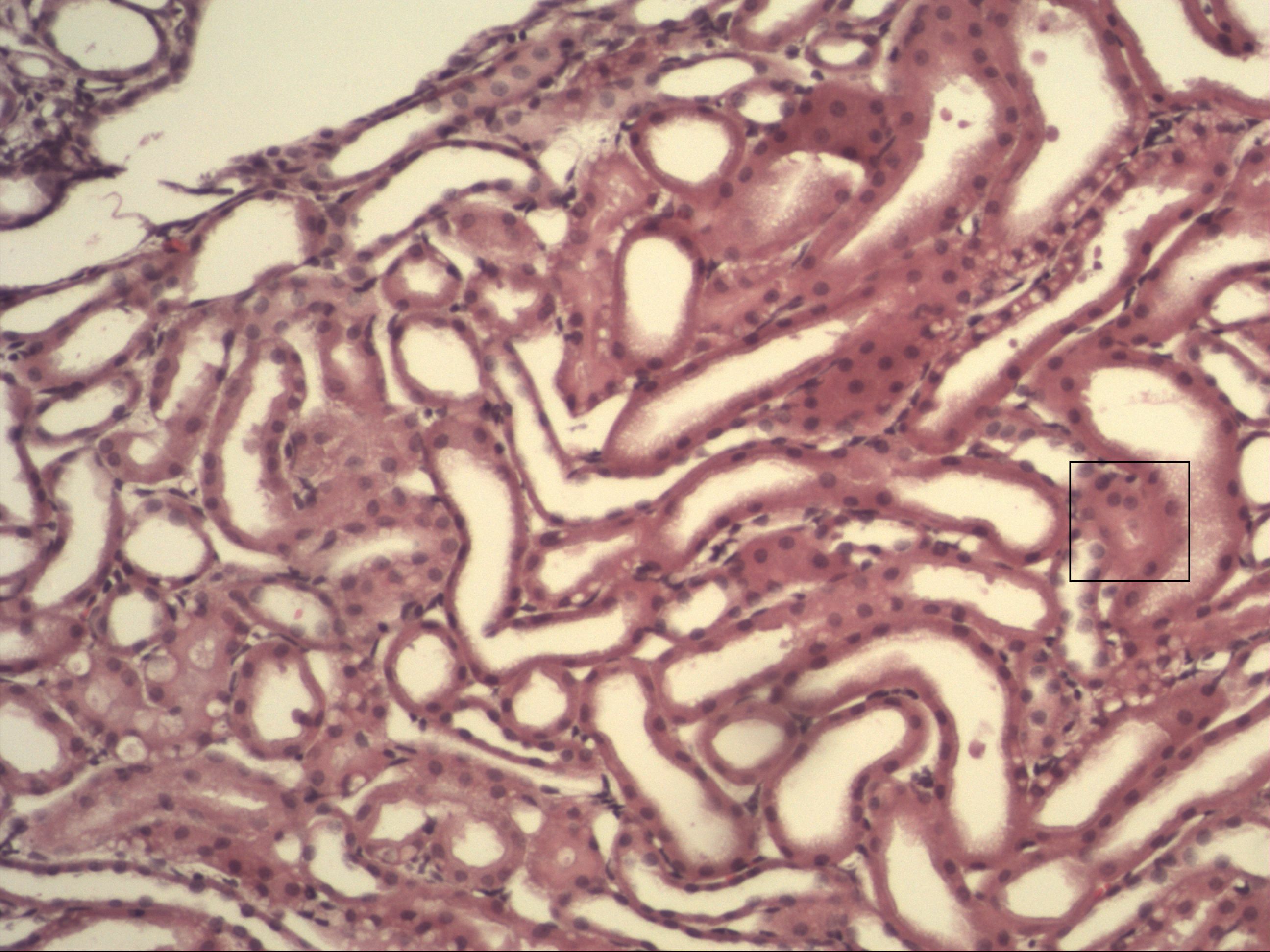 Ein histologischer Schnitt des Nierengewebes. Man erkennt Tubuli. Sammelrohre sind nicht zu erkennen. Diese sind größer und die Zellgrenzen lassen sich besser unterscheiden.