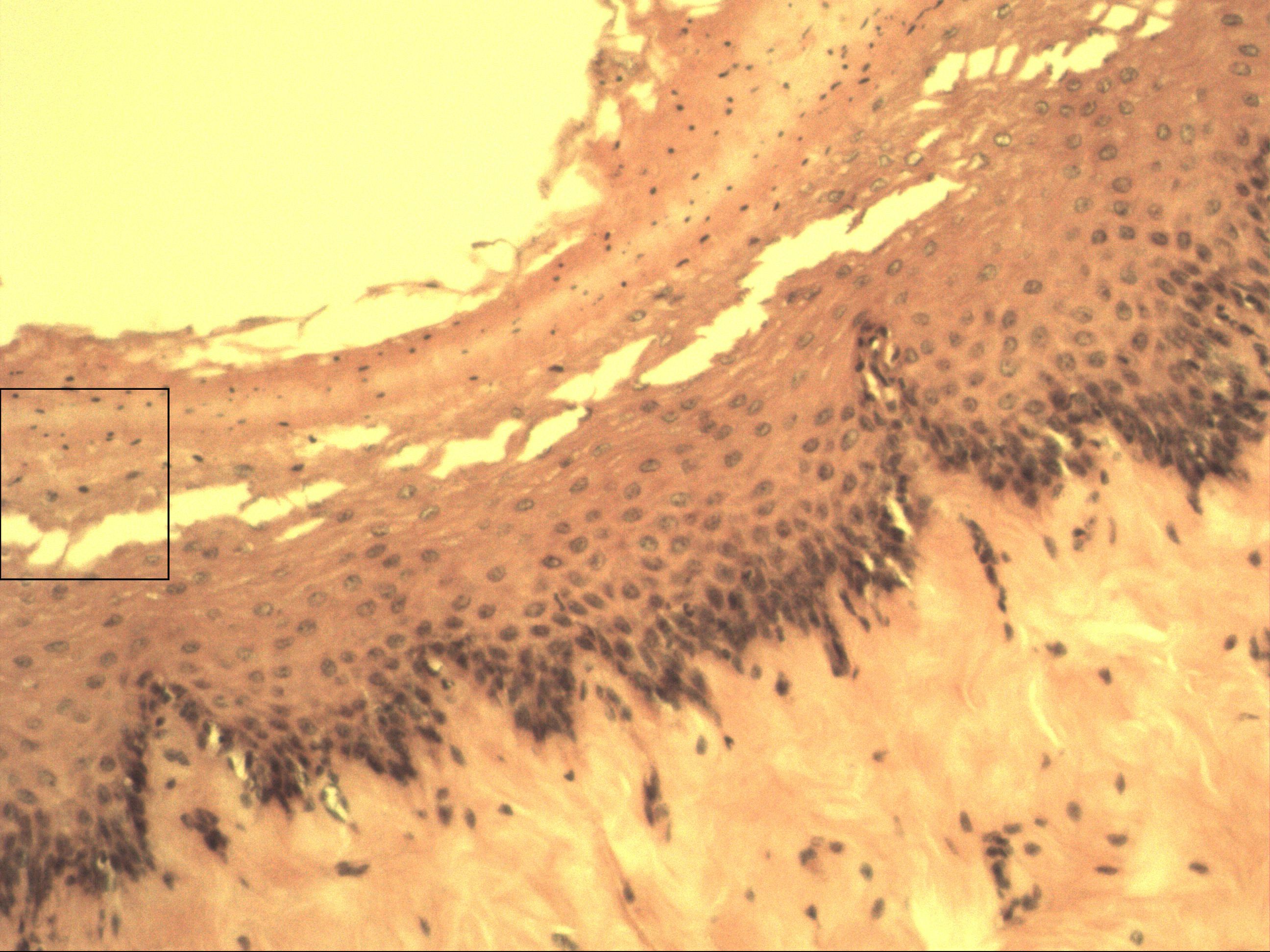 Das mehrschichtig unverhornte Plattenepithel ist typisch für mechanisch beanspruchte Zonen. Es kommt sowohl in der Speiseröhre und in der Mundhöhle als auch im Analkanal und der Vagina vor. Außerdem in der Horn- und Bindehaut des Auges. Und im letzten Teilabschnitt der männlichen Harnröhre. Man erkennt diese drei Schichten: Stratum basale, Stratum intermedium und Stratum superficiale (mit buckeligen Zellen).