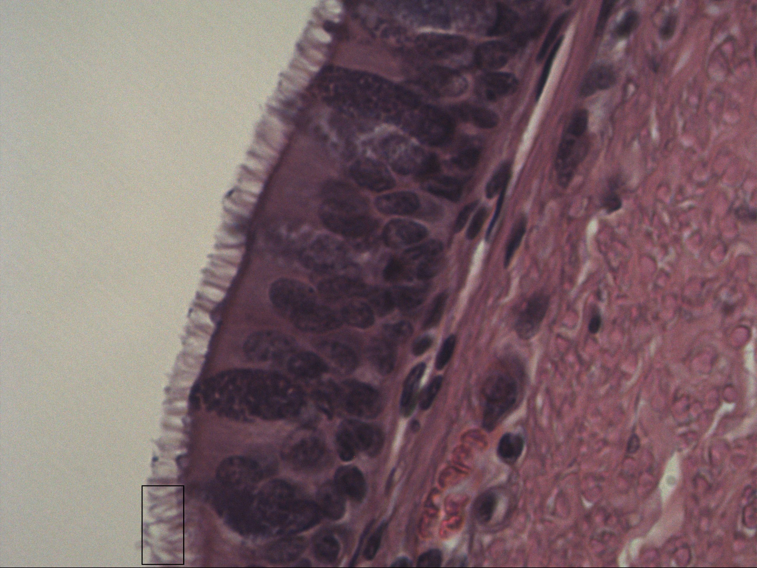 Mehrreihiges hochprismatisches Flimmerepithel mit Kinozilien. Man erkennt Basalzellen und etwas höher gelegene Zellen am Zellkern. Das Flimmerepithel besitzt Kinozilien. Das Epithel kann sich bei Rauchern in ein Plattenepithel umwandeln (Metaplasie).