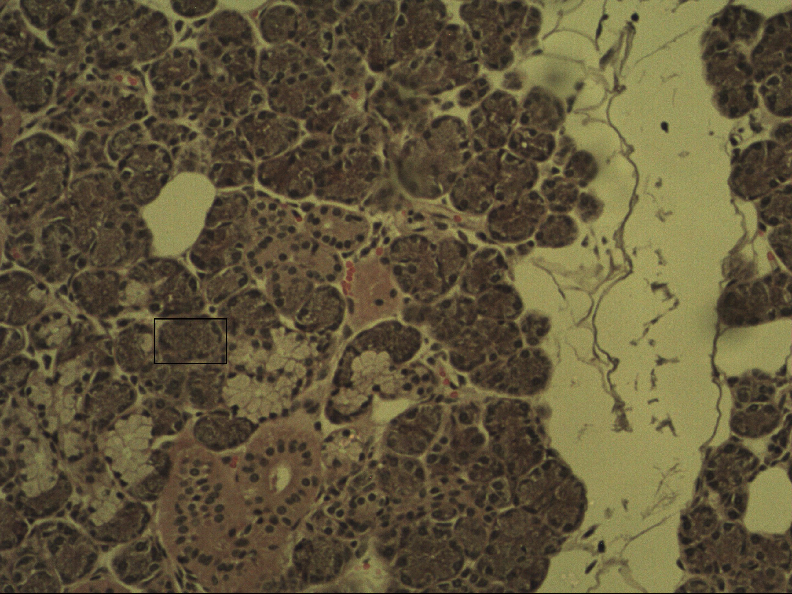 Hier erkennt man eine gemischte Drüse: Es handelt sich um eine serösmuköse Drüse. Dies bedeutet, dass man mehr seröse anstatt muköse Drüsen vorfindet. Dies lässt sich hier auch Anhand der Entstücke nachvollziehen. Außerdem ist ein Halbmond zu erkennen und ein Ausführungsgang. Ausführungsgänge werden in Schaltstücke und Streifenstücke (größeres Lumen) eingeteilt.